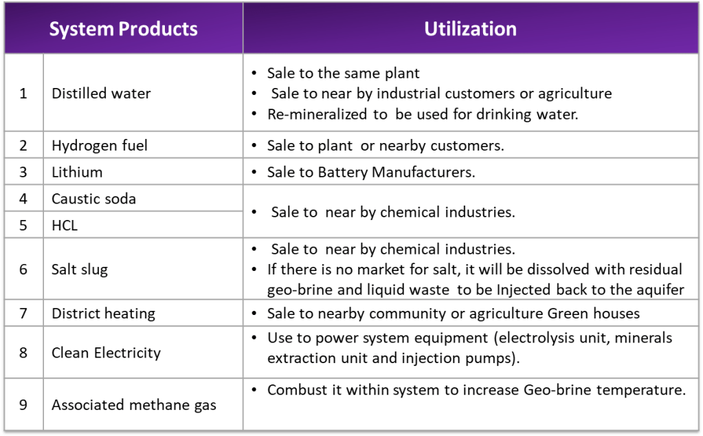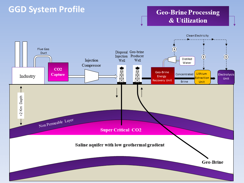 - GGD has many revenue streams from original Geo-brine flow products to compensate the high cost of CCS (including extracted Lithium from Geo-brine. Hydrogen Fuel Production, 24/7 clean electricity production, Distilled water production, Salts Production ,Dissolved methane gas extraction and Works also as a large scale energy storage battery).