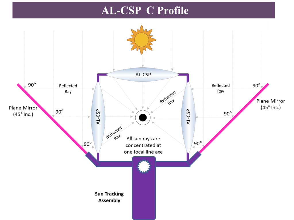 AL-CSP is a new scalable CSP concept and systems contain different novel configurations of large size, fixed and movable Linear/Spherical plastic lenses -filled with water- sharing the same focal line/focal point with oriented plane mirrors at 45° inclination at lateral sides in order to optimize thermal solar extraction to ultra-high temperature levels.