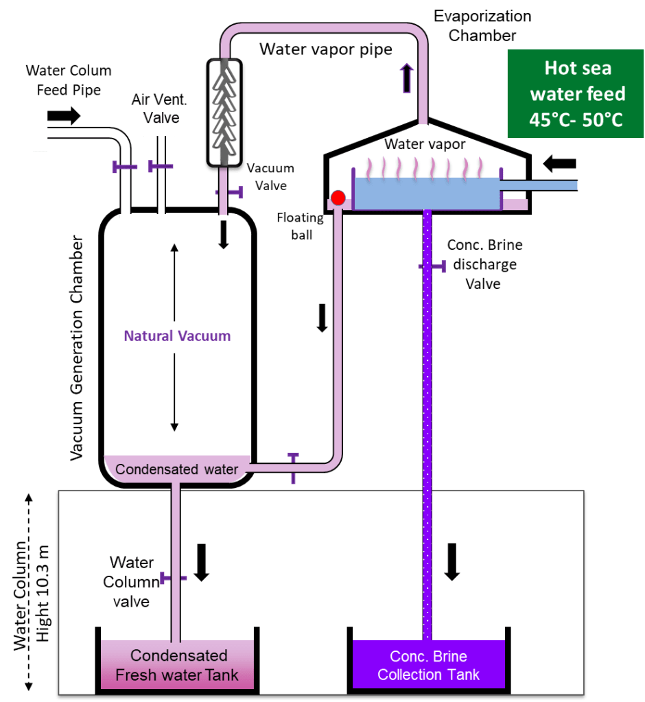 The new invention Enhanced Gravity Based Vacuum System (EGV) is based on reducing the atmospheric pressure to nearby vacuum within the system through natural vacuum or through water suction pump -instead of the intensive energy consumption air vacuum pump- in order to reduce the boiling point of water to be around 40C. and immediately condensates the generated vapor by our novel technique.