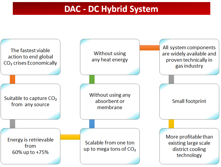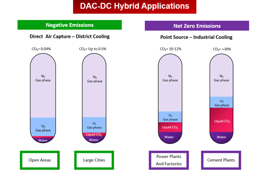 SGE had developed its novel Carbon Capture Technology DAC-DC Hybrid system for large scale direct air capture (DAC) and point source capture. In order to capture CO₂ for free as a by-product from large scale district cooling or industrial cooling process.