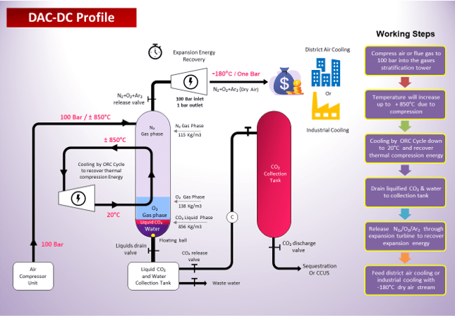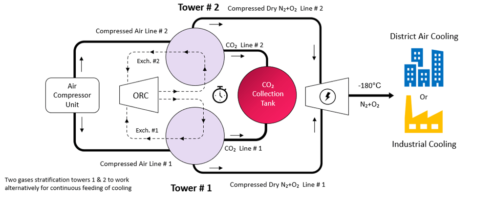As CO₂ changes its gaseous phase into a liquid phase under much less temperature and pressure than the other air components (N₂, O₂ and Ar₂). So the present invention is working based on compressing and cooling air/flue gas to the minimum limit of liquefying CO₂ only (Example : 100 Bar/20°C within a novel gases stratification tower) and separate it mechanically as a liquid for sequestration or utilization while keeping N₂, O₂ and Ar₂ at their original gaseous phase overlaying the liquefied CO₂ (according to their densities) to be released later as cooled-pressurized dry air stream for district air cooling or for industrial cooling, with recovering the compressional thermal heat energy and the expansion energy of the released dry-cooled-pressurized N₂ , O₂ and Ar₂ gases.